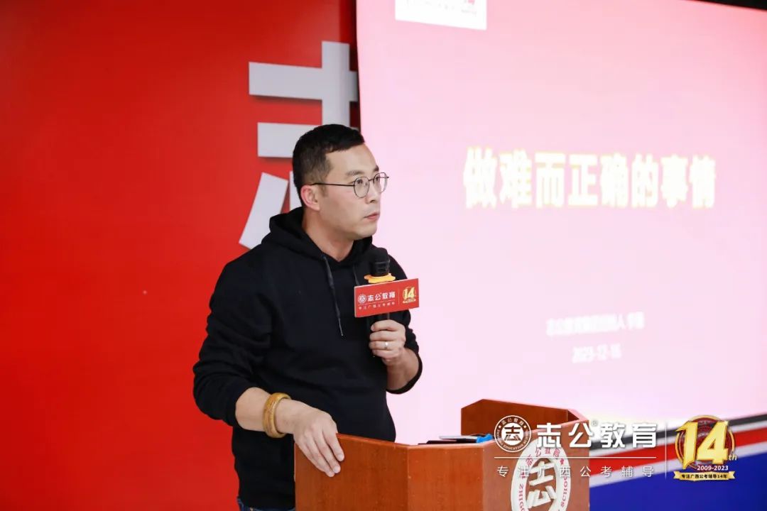 16日上午9點許,董事長李勇發表致辭,他認為:“聚焦是一種力量”,對于志公教育而言,聚焦就是專注廣西公考輔導。