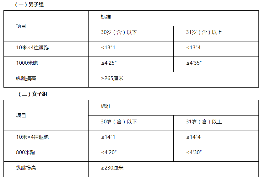 體能測評三項全部達標方為合格。體能測評項目中,縱跳摸高的測試次數不超過3次,10米×4往返跑的測試次數不超過2次,長跑項目(男子1000米、女子800米)的測試次數為1次。