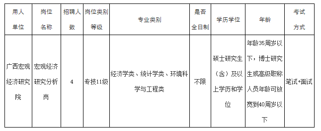 本次公開招聘實名編制工作人員4名,要求普通高等學校畢業,經濟學類、統計學類和環境科學與工程類專業,具有碩士研究生(含)及以上學歷和學位,年齡35周歲以下(年齡截止報名首日),博士研究生或高級職稱人員年齡可放寬到40周歲以下(年齡截止報名首日)。
