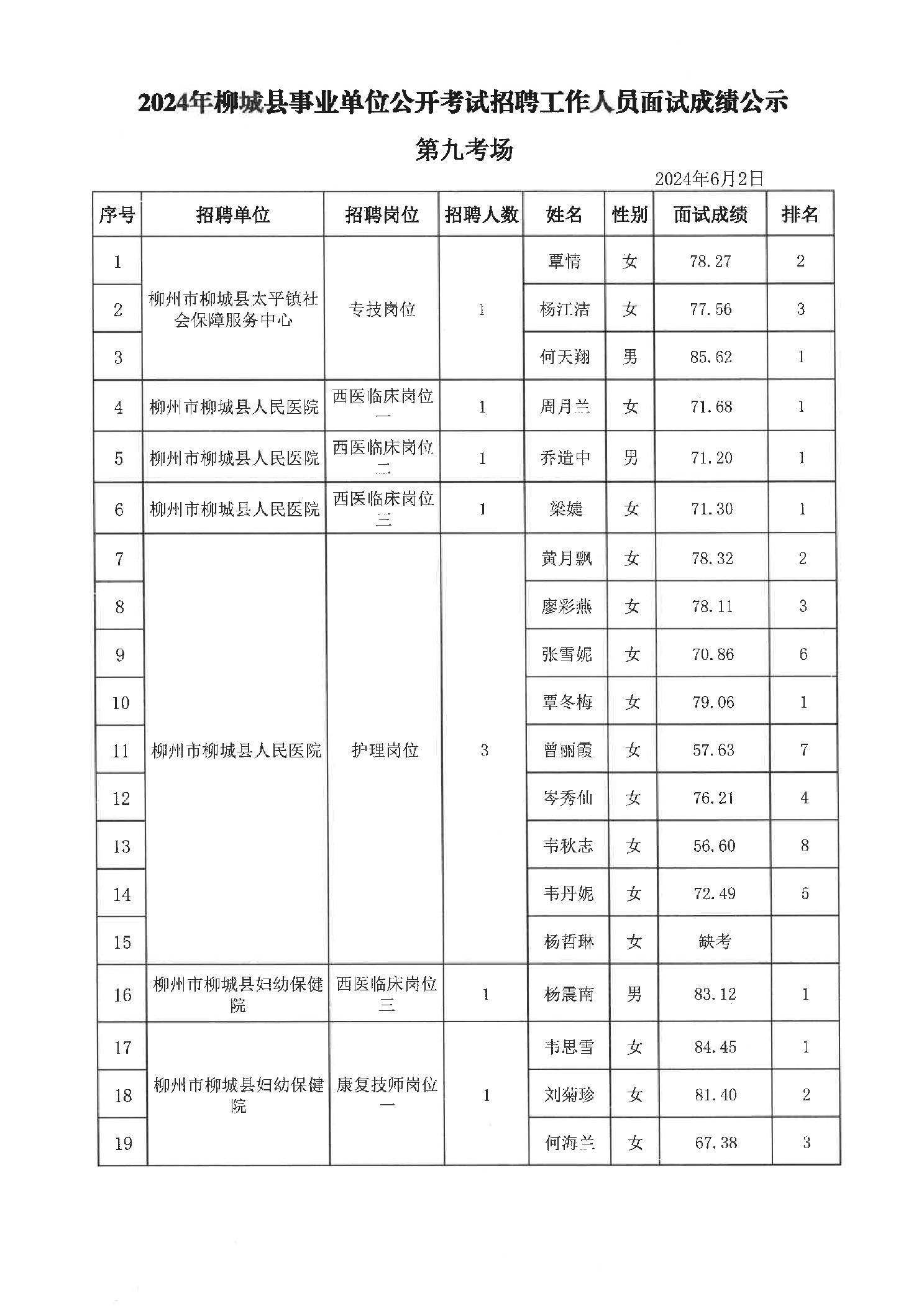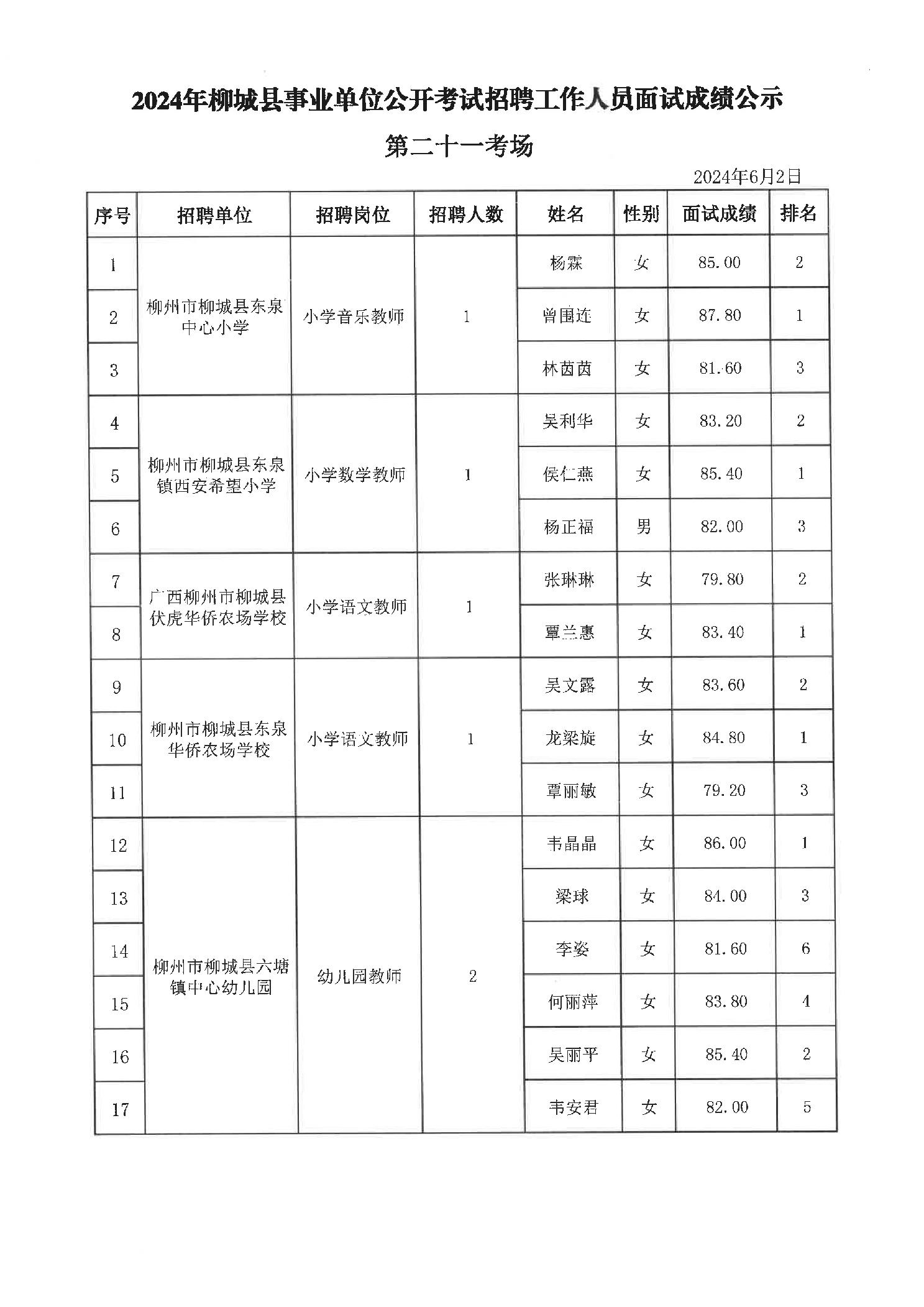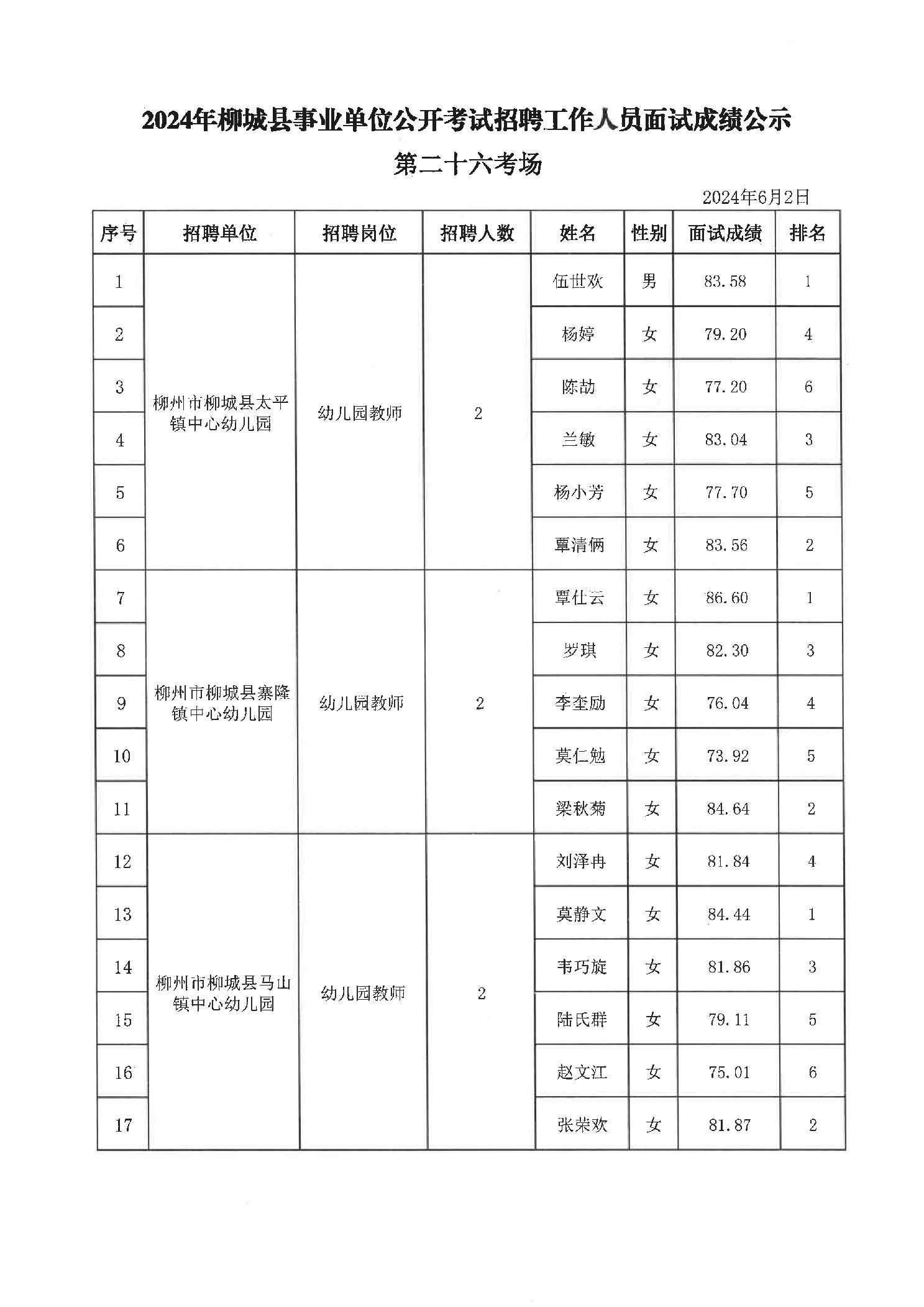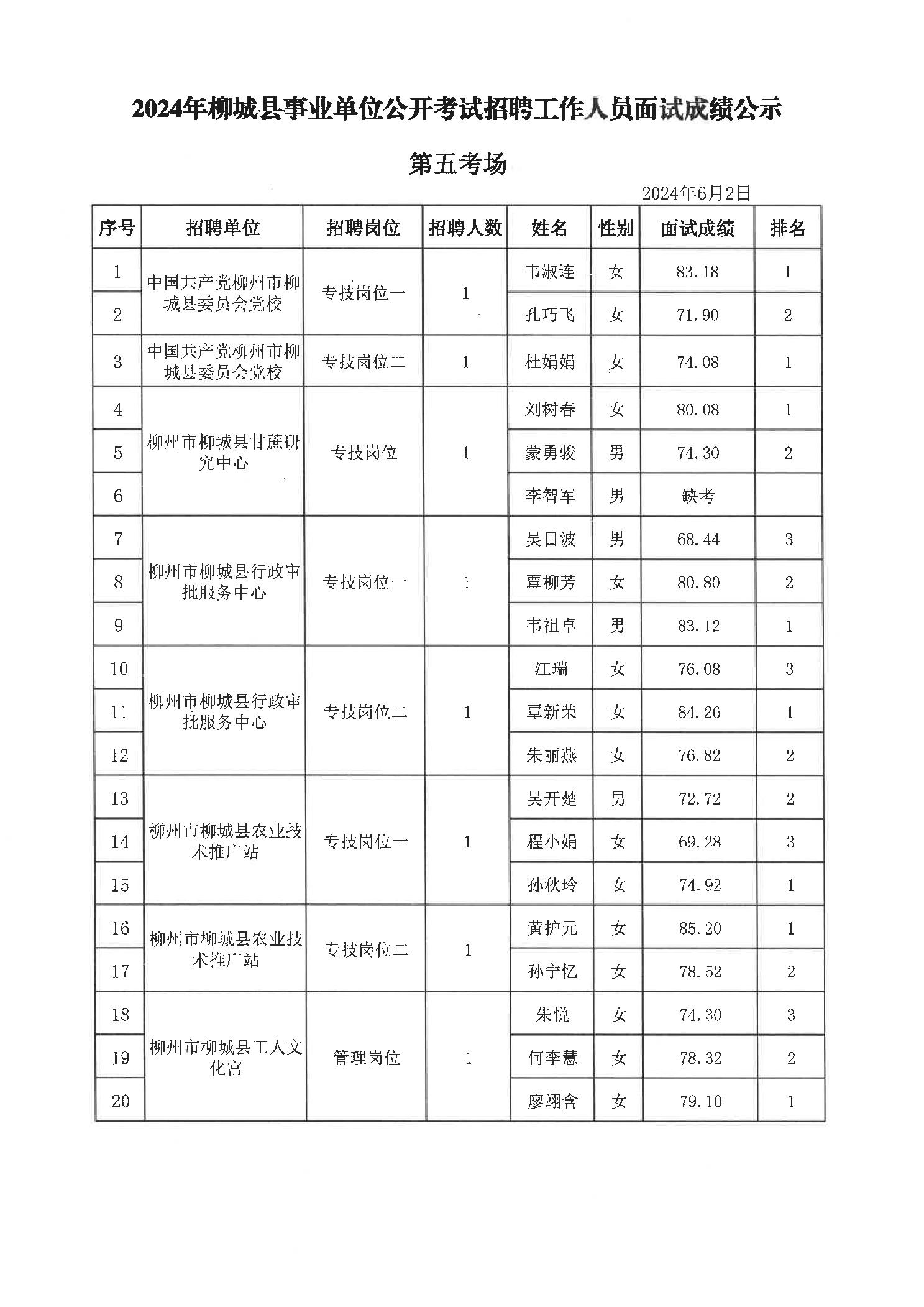 2024年柳城縣事業單位公開考試招聘工作人員面試成績公示