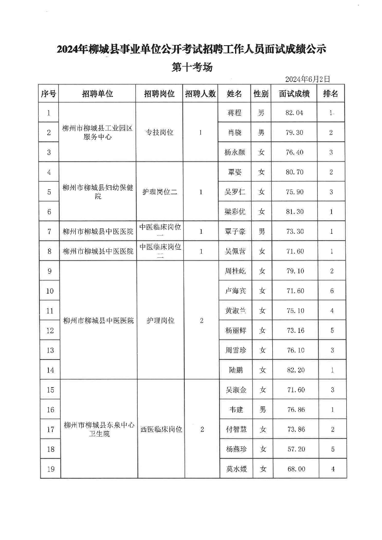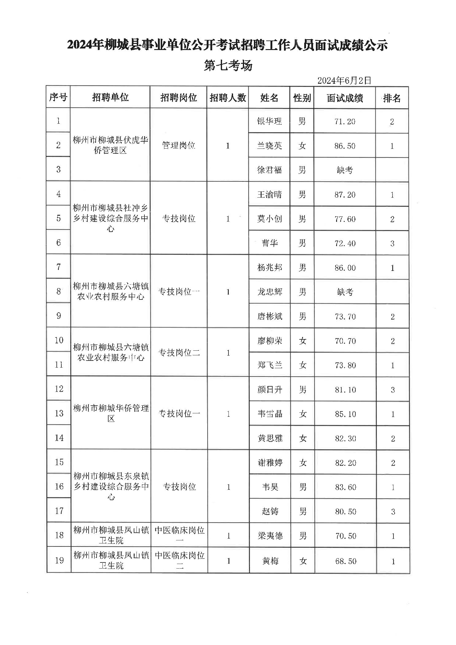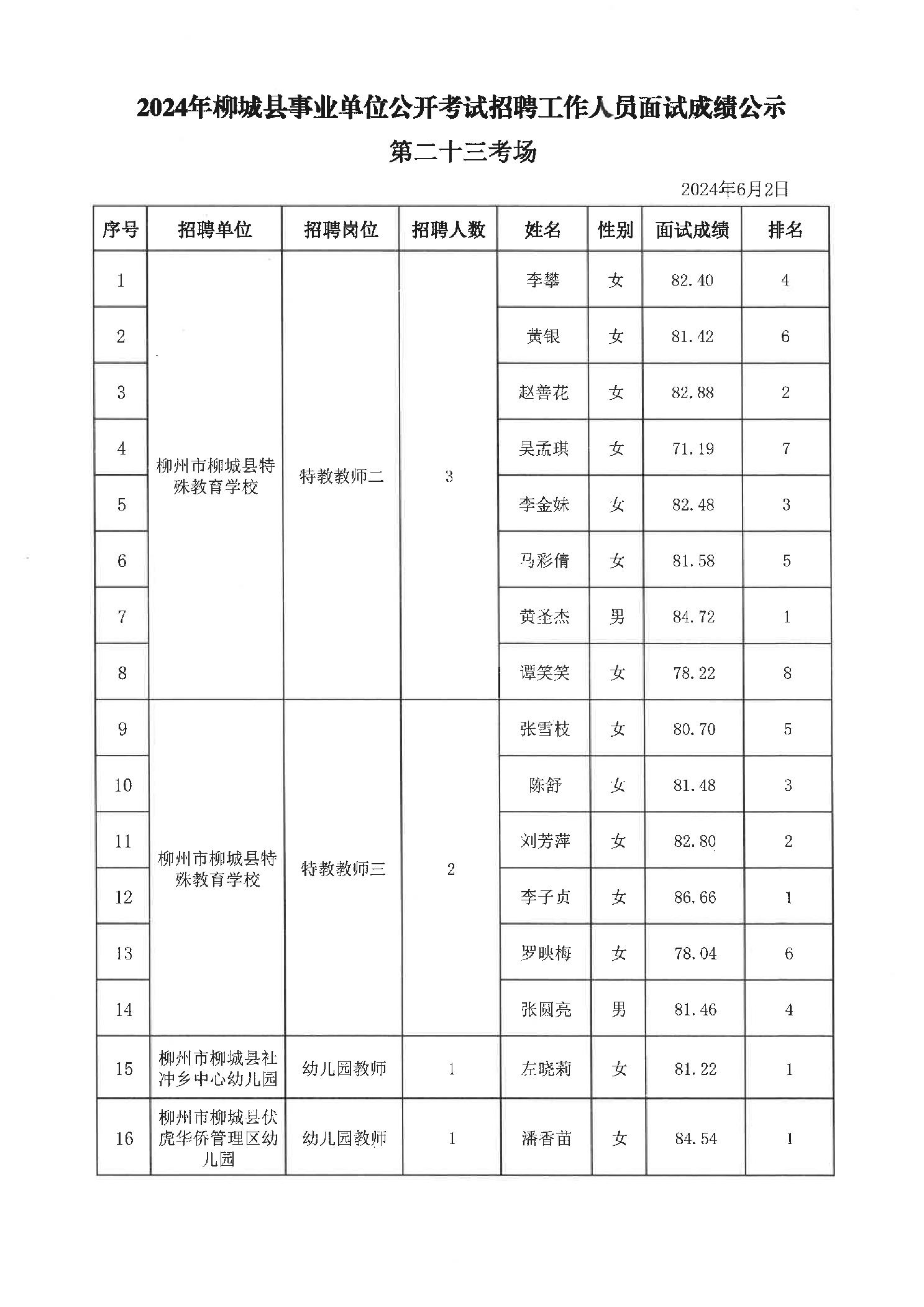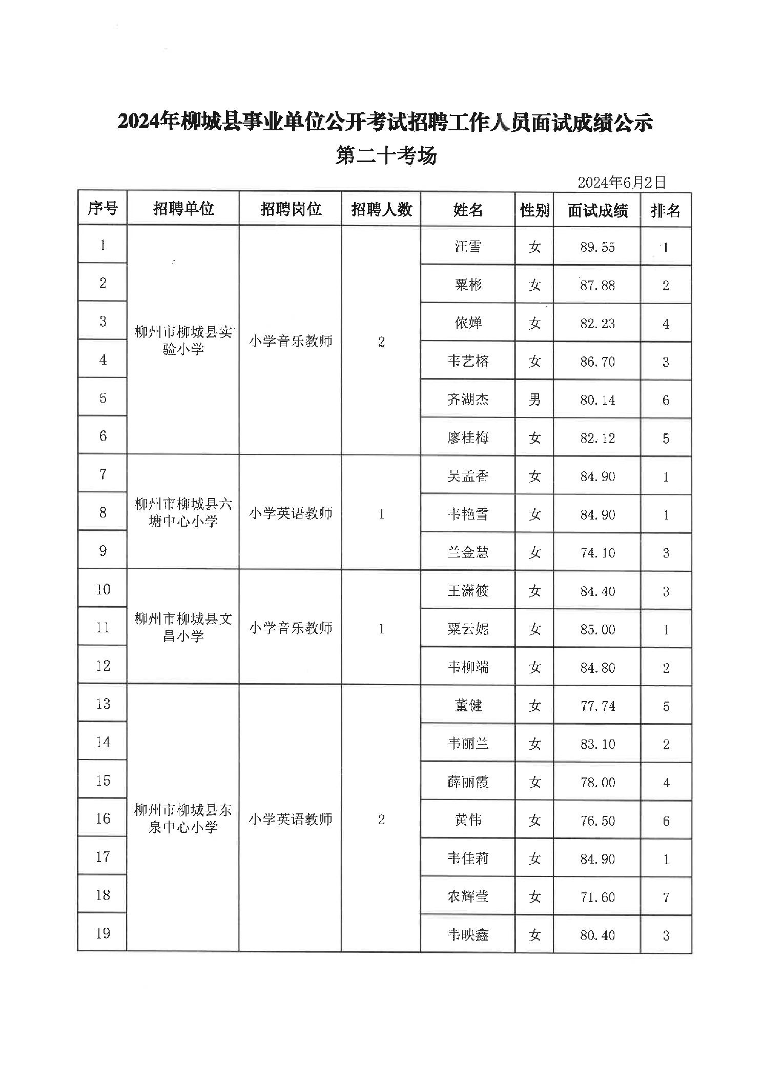 2024年柳城縣事業單位公開考試招聘工作人員面試成績公示