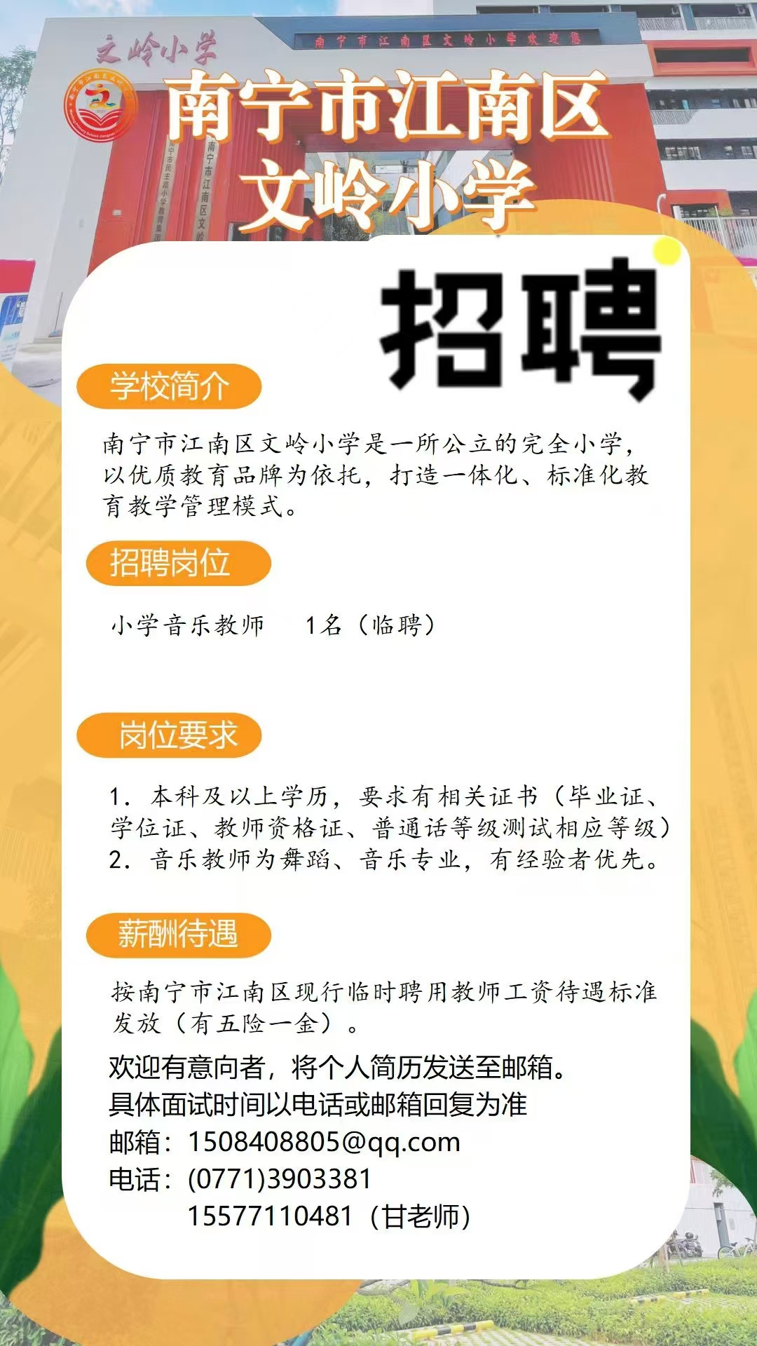 南寧市江南區文嶺小學招音樂老師