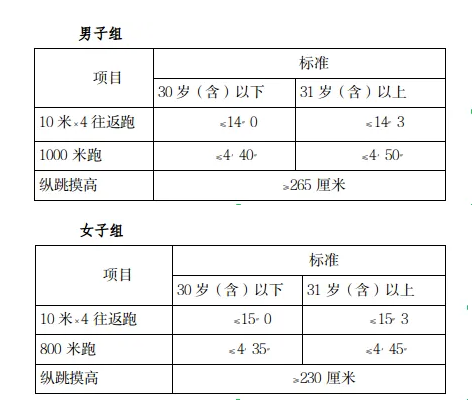 參照《關于印發公安機關錄用人民警察體能測評項目和標準(暫行)的通知》(人社部發〔2011〕48號)的項目及測試規則,結合《公安民警體育鍛煉達標手冊》成績標準,本次體能測評的項目和標準如下: