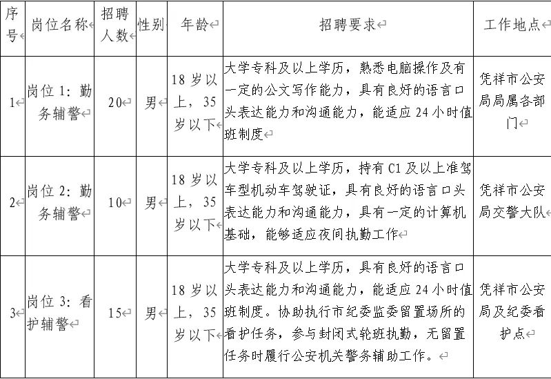 為適應(yīng)憑祥市公安機(jī)關(guān)管理工作發(fā)展需要,憑祥市公安局決定面向社會(huì)公開招聘40名警務(wù)輔助人員(以下簡(jiǎn)稱輔警)。具體事宜如下: