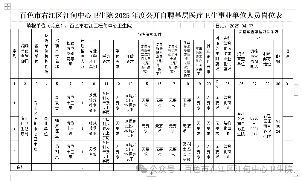 原文標題:百色市右江區汪甸中心衛生院2025年度公開招聘基層醫療衛生事業單位人員公告