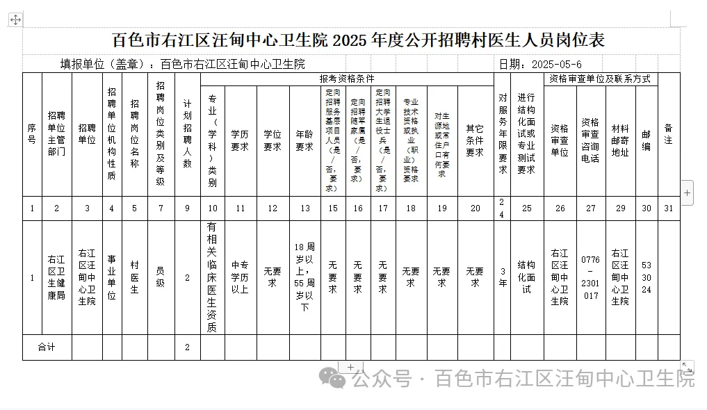 原文標題:百色市右江區汪甸中心衛生院2025年度公開招聘村醫生人員公告