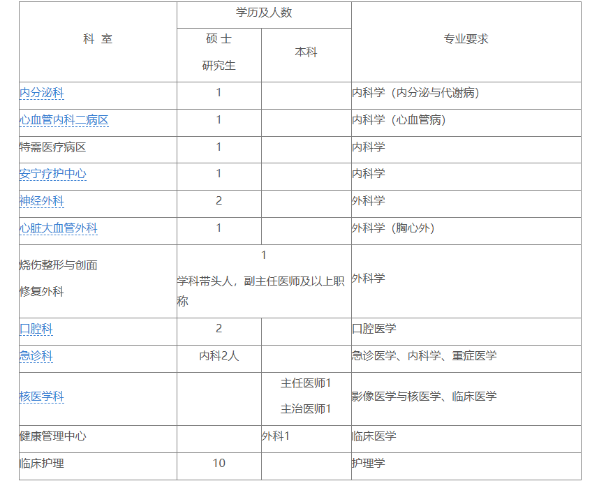 4.臨床醫師、醫技人員一般要求35周歲以下,特別優秀者可酌情放寬條件;護理人員要求為應屆畢業生,30周歲以下,碩士研究生及以上學歷者可放寬年齡條件。