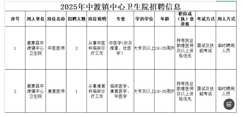 原文標題:鹿寨縣中渡鎮中心衛生院2025年招聘公告