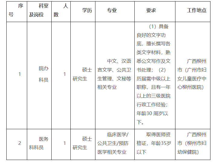 根據醫院發展需要,廣州市婦女兒童醫療中心柳州醫院、柳州市婦幼保健院現向社會招聘醫務科和院辦科員各一名,具體要求如下: