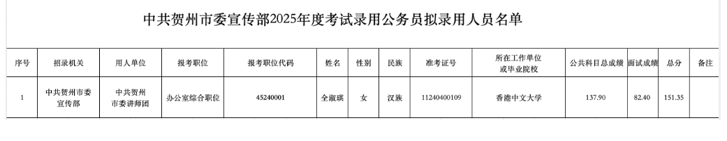 根據《廣西壯族自治區2025年度考試錄用公務員公告》要求,經過公開報名、資格審查、筆試、面試、體檢、考察等程序,確定全淑琪1名同志為擬錄用公務員,現予以公示。公示期為2025年6月6日至6月12日(5個工作日)。如對擬錄用人員有異議,請在公示期內向中共賀州市委宣傳部實名反映。