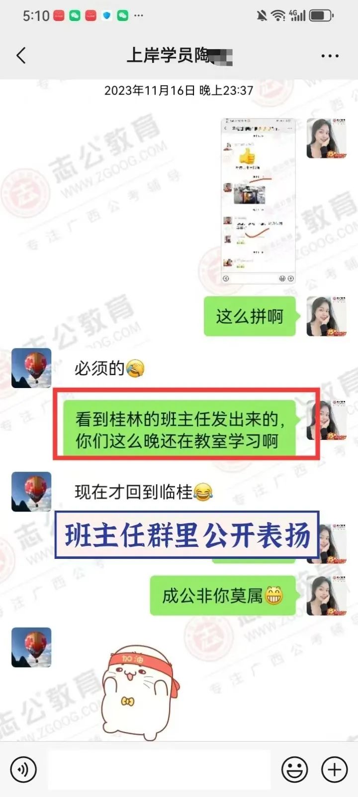 在備考的日子里,無數(shù)個(gè)夜晚,我看到他朋友圈發(fā)的經(jīng)常學(xué)習(xí)練習(xí)到教室關(guān)門最后一個(gè)才回家,無數(shù)次往返南寧和桂林兩座城市,只為家庭和研究生學(xué)業(yè)和公務(wù)員備考的有序進(jìn)行,讓我印象最深的一次,就是他微信拍了一張正在打針輸液的照片發(fā)給我,還打趣的跟我說:還好不影響我單手刷題! 即使學(xué)員因?yàn)樯眢w過于勞累導(dǎo)致生病在吊針,也絲毫沒有懈怠過學(xué)習(xí),讓我非常的佩服和感動(dòng)。