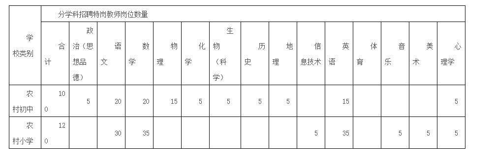 計(jì)劃招聘特崗教師220名,其中:小學(xué)120名,初中100名。具體崗位計(jì)劃如下表。