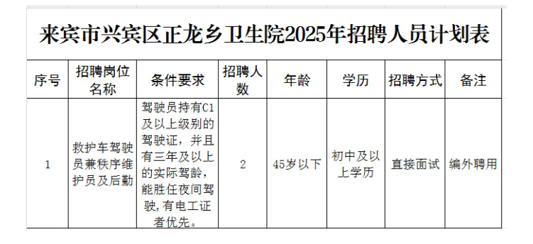 原文標題:【招聘】來賓市興賓區正龍鄉衛生院2025開招聘非醫學類編外工作人員公告