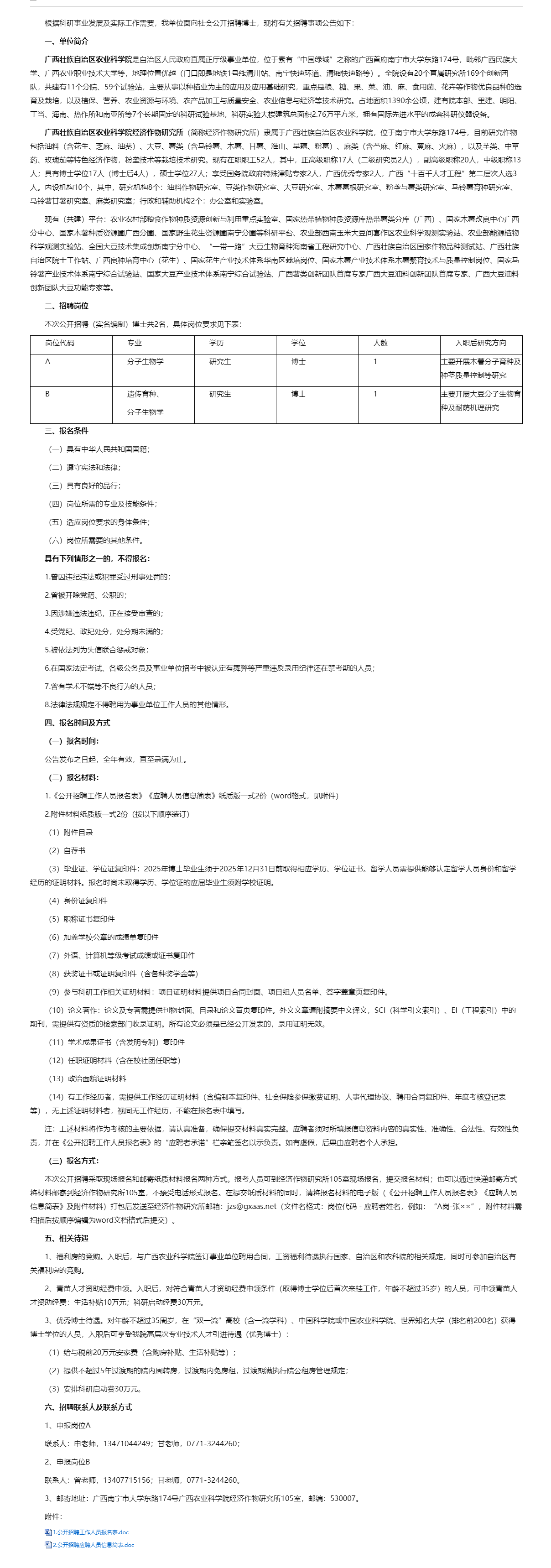 原文標題:廣西農業科學院經濟作物研究所2025年博士公開招聘公告