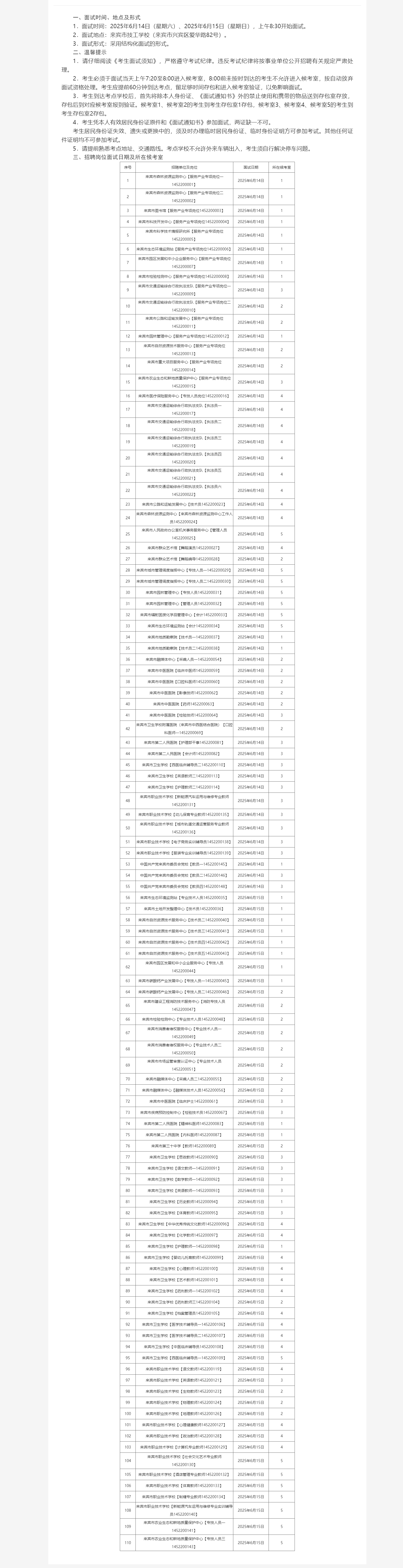 來(lái)賓市2025年市直事業(yè)單位公開招聘人員面試招聘崗位所在候考室和溫馨提示