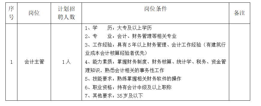 根據我公司業務發展需要,現面向社會公開招聘會計主管1名,相關事宜如下: