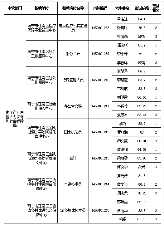 原文標題:南寧市江南區人力資源和社會保障局2025年公開考試招聘事業單位工作人員面試成績表