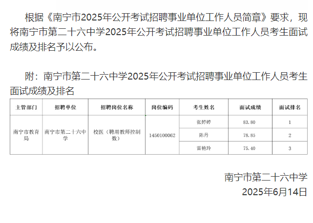 南寧市第二十六中學關于公布2025年公開考試招聘事業單位工作人員考生面試成績及排名的公告