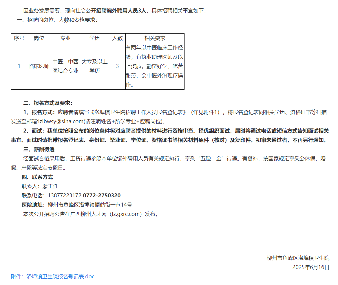 原文標題:柳州市魚峰區洛埠鎮衛生院招聘簡章