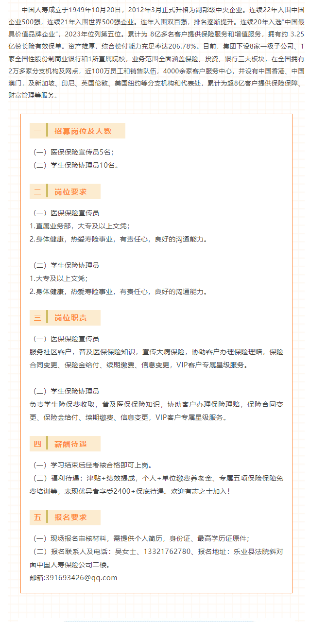 原文標題:中國人壽保險股份有限公司樂業支公司招募15名工作人員,期待你的加入