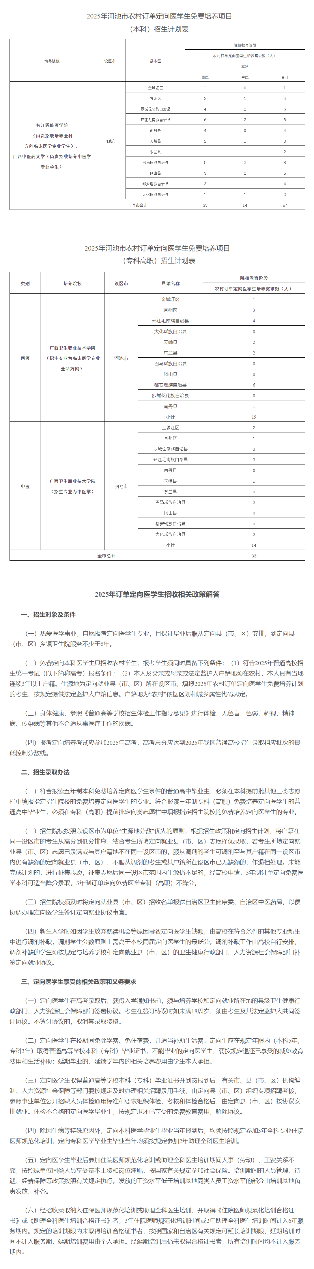 2025年,廣西繼續實施定向醫學生免費培養項目,面向全區招生。河池市共有80個名額,其中,本科47個,專科33個,培養院校分別為:右江民族醫學院、廣西中醫藥大學、廣西衛生職業技術學院,培養專業為臨床醫學和中醫學。