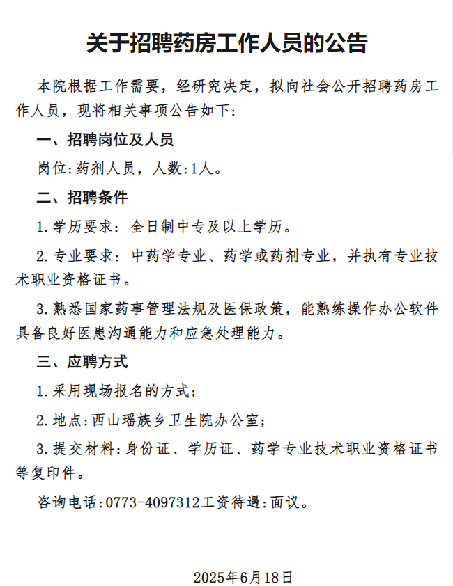 原文標題:灌陽縣西山瑤族鄉衛生院關于招聘藥房工作人員的公告