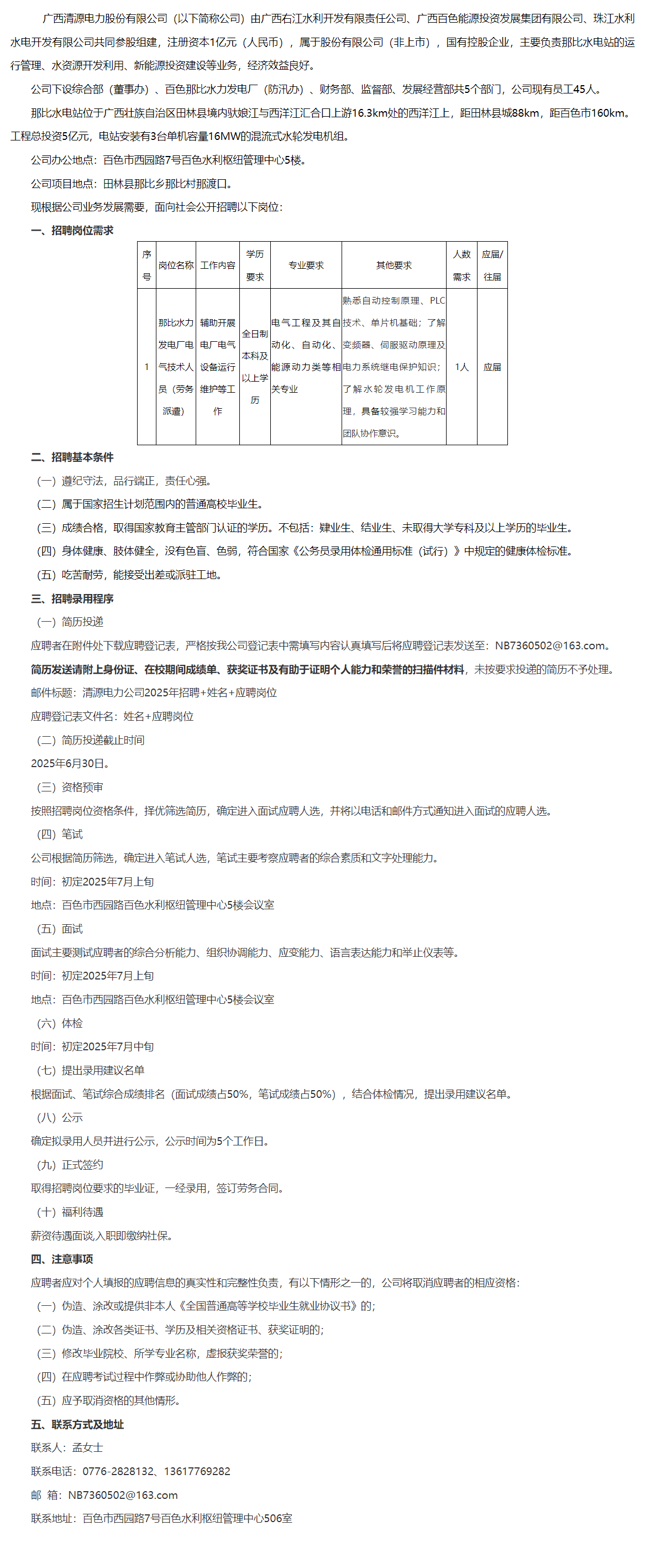 原文標題:廣西清源電力股份有限公司2025年勞務派遣人員招聘公告