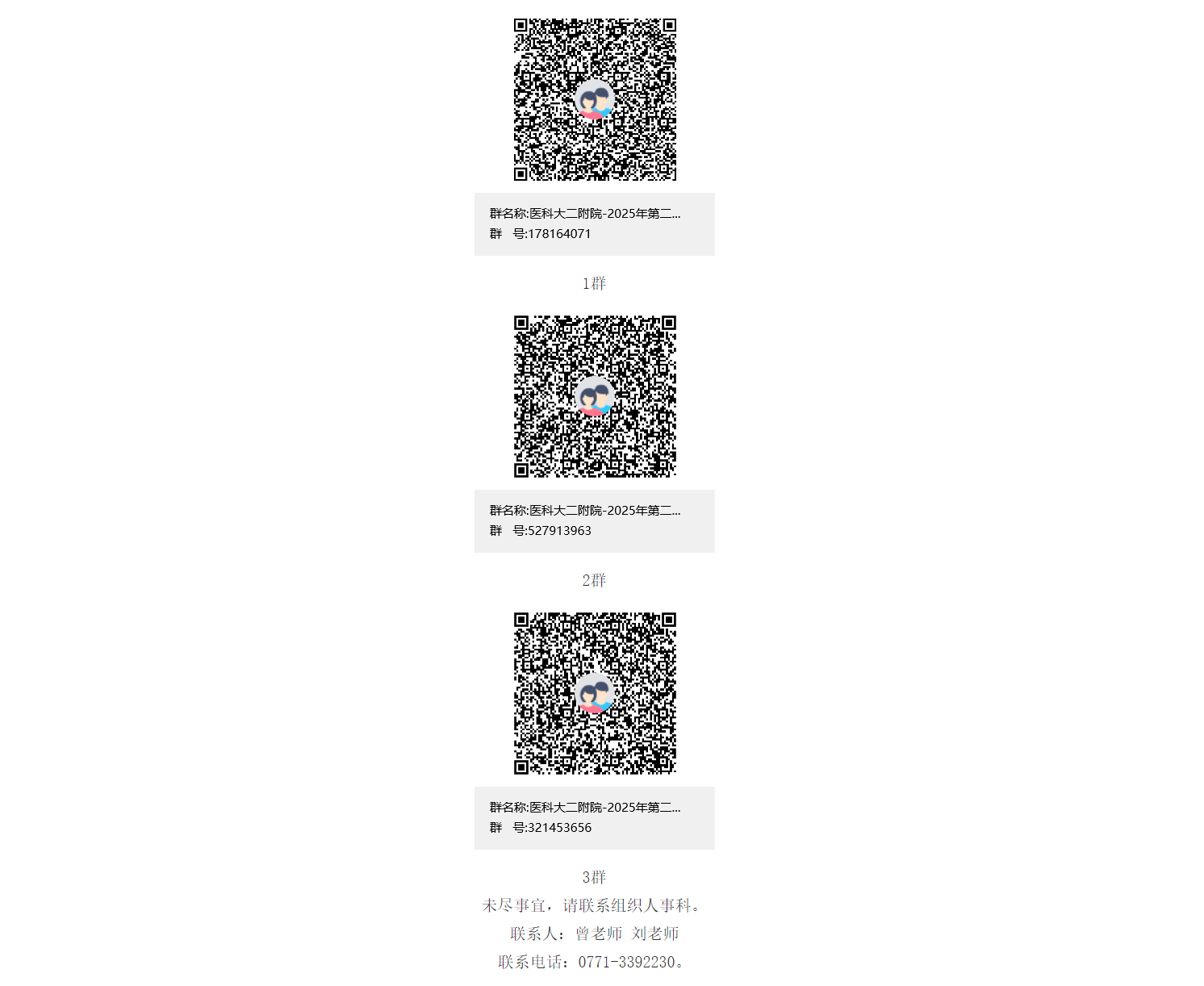 考核與面試的時間、地點另行通知,擇優聘用。通過資格審核的考生名單及相關考試事宜將在“醫科大二附院-2025年第二批醫技藥行政招聘群”發布,請應聘者務必進群并關注群消息,不再另行通知。請通過搜索群號碼(1群:178164071、2群:527913963、3群:321453656)或掃碼加群(1群滿后請加2群、3群):