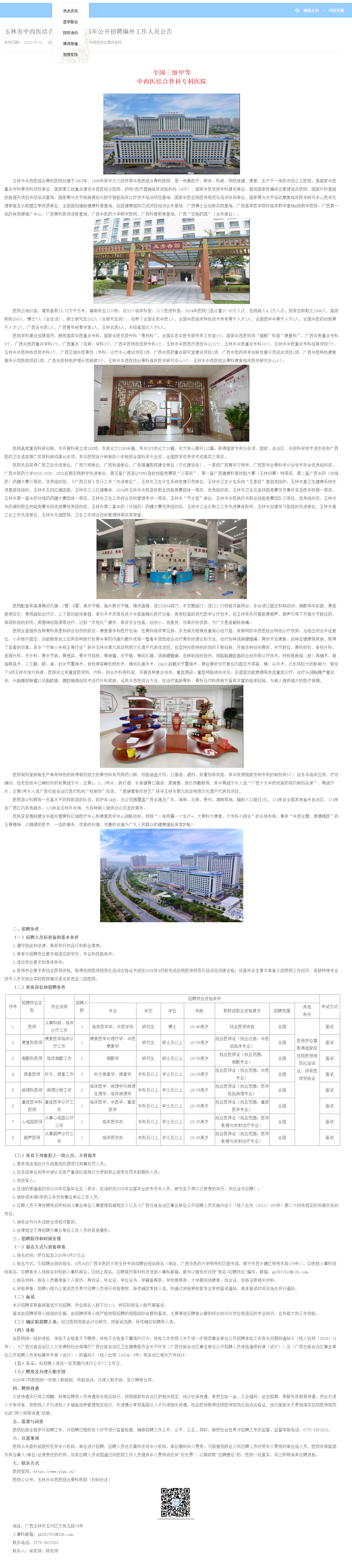 2025年玉林市中西醫結合骨科醫院招聘編外工作人員公告
