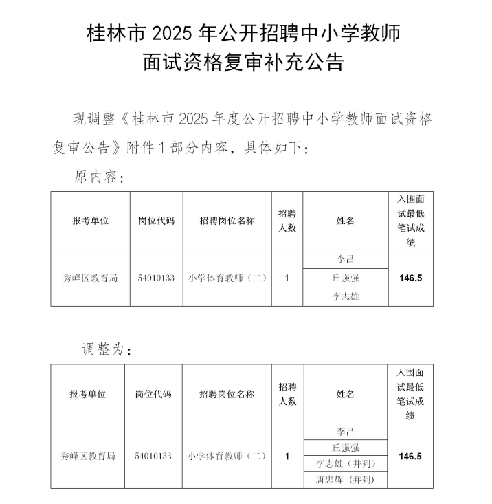 原文標題:桂林市2025年公開招聘中小學教師面試資格復審補充公告