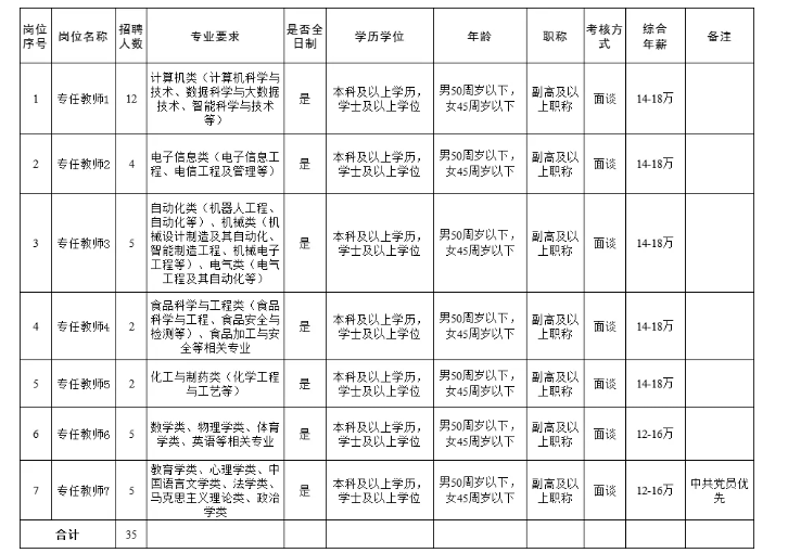 本次公開招聘副高及以上職稱專任教師共計35名,具體招聘崗位及條件如下: