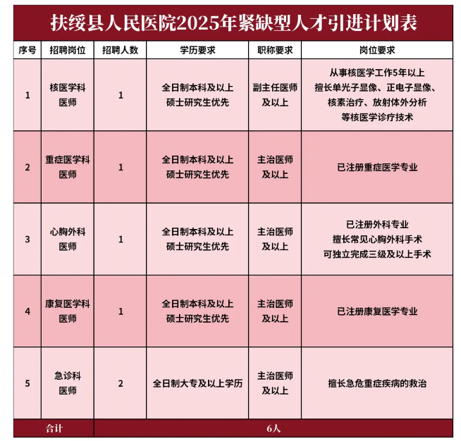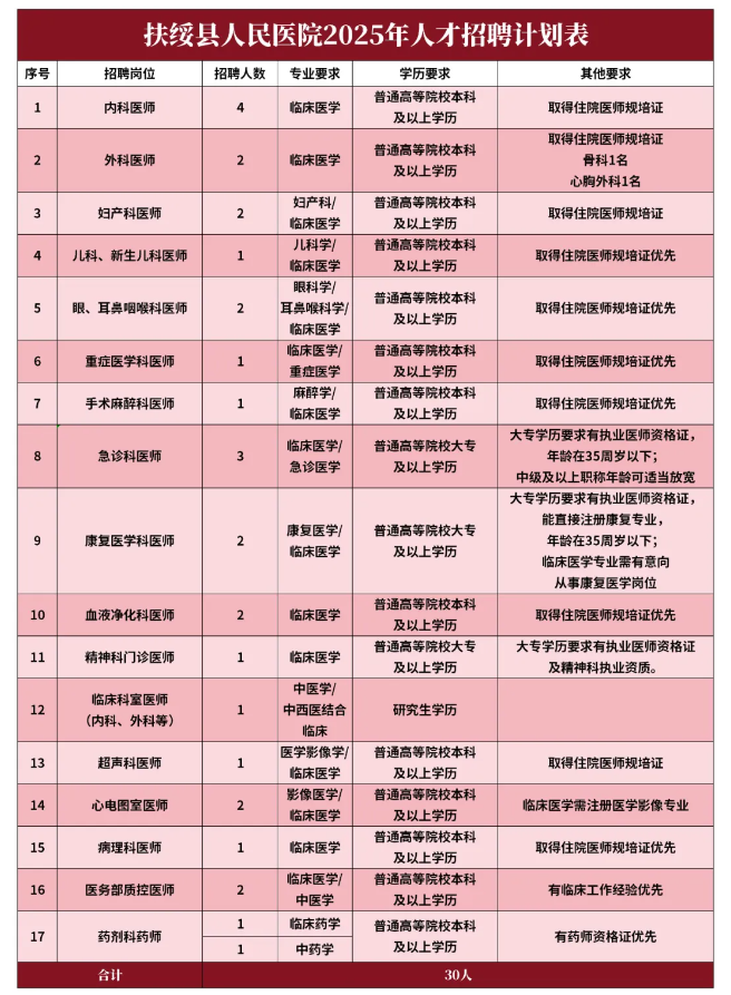 為進一步充實現有人才隊伍,促進醫院學科發展,提升醫院綜合實力,結合醫院實際工作需要,扶綏縣人民醫院決定面向社會進行公開招聘各類醫學人才,具體招聘事宜如下: