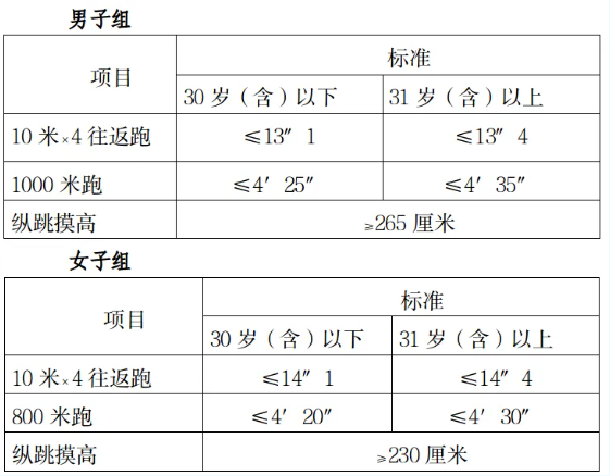 2.體測項目和標準。參照《關于印發公安機關錄用人民警察體能測評項目和標準(暫行)的通知》(人社部發〔2011〕48號)的項目及測試規則,結合《公安民警體育鍛煉達標手冊》成績標準,本次體能測評的項目和標準如下: