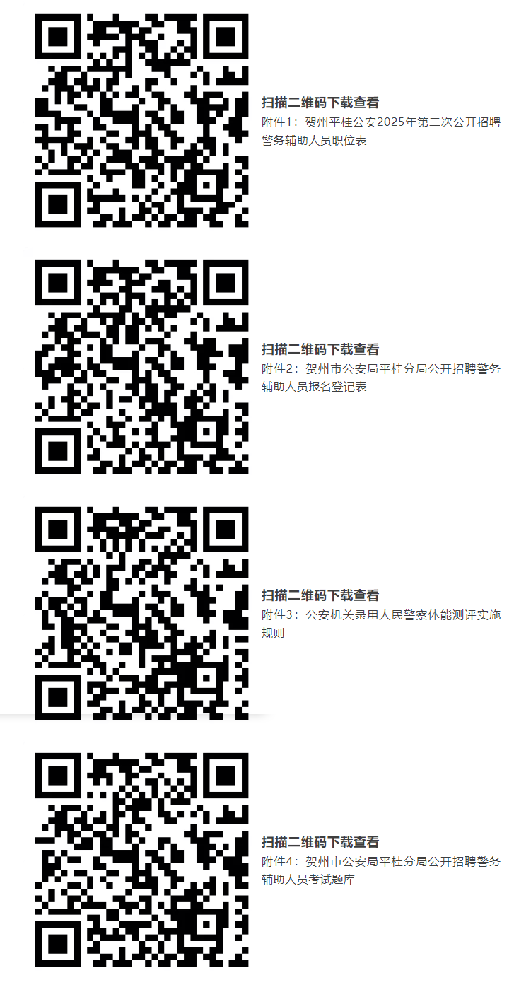 報考人員自2025年7月21日起,可通過賀州市公共就業和人才服務中心“賀州市微就業”官方微信(gxhzjy)、賀州市公安局平桂分局“平桂警方”官方微信(pggafj)查閱招聘簡章及《職位計劃表》(附件1)等相關招聘信息。