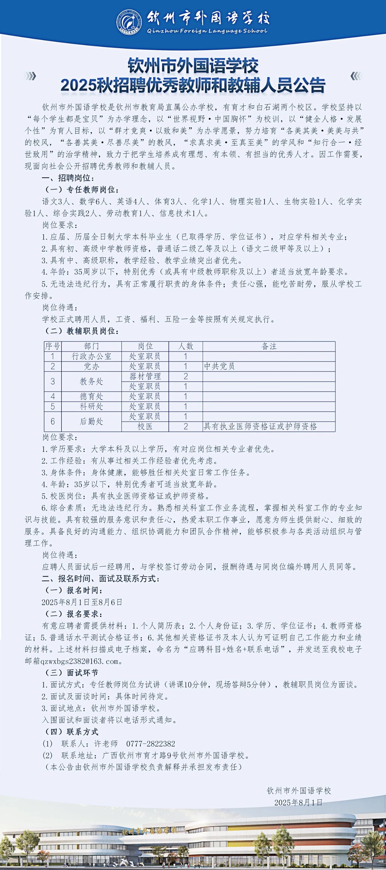 2025年欽州市外國語學校秋招聘優秀教師和教輔人員若干人