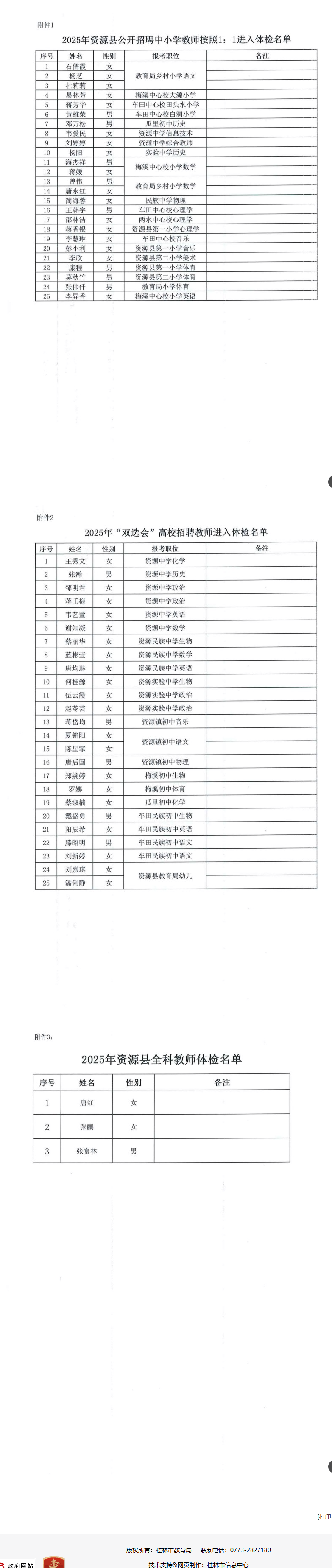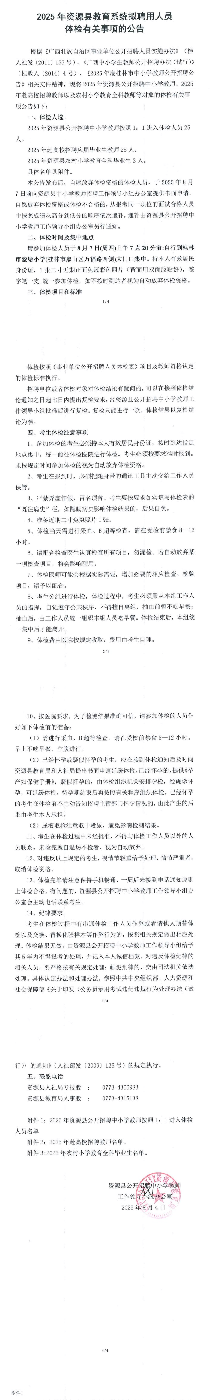 2025年資源縣教育系統擬聘用人員體檢有關事項的公告