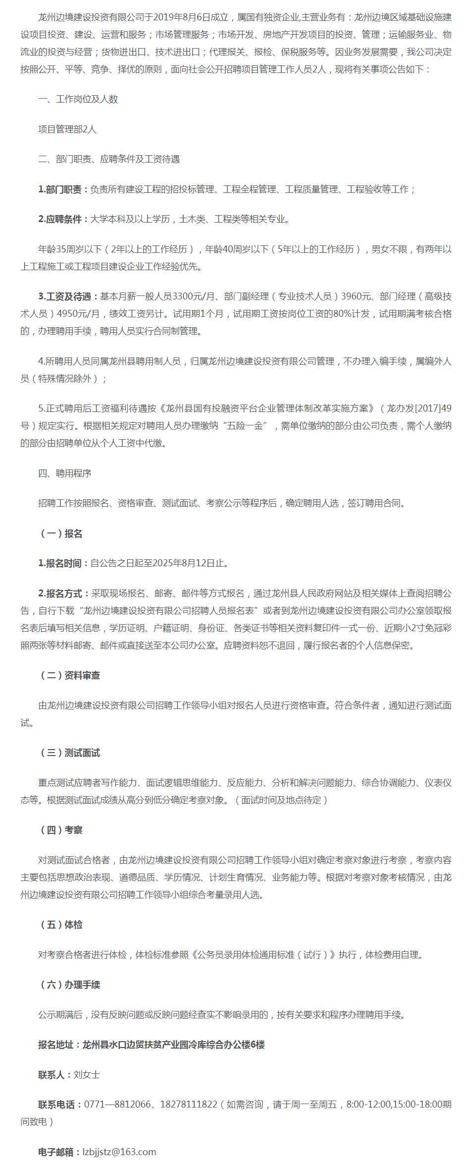 原文標題:龍州邊境建設投資有限公司招聘公告