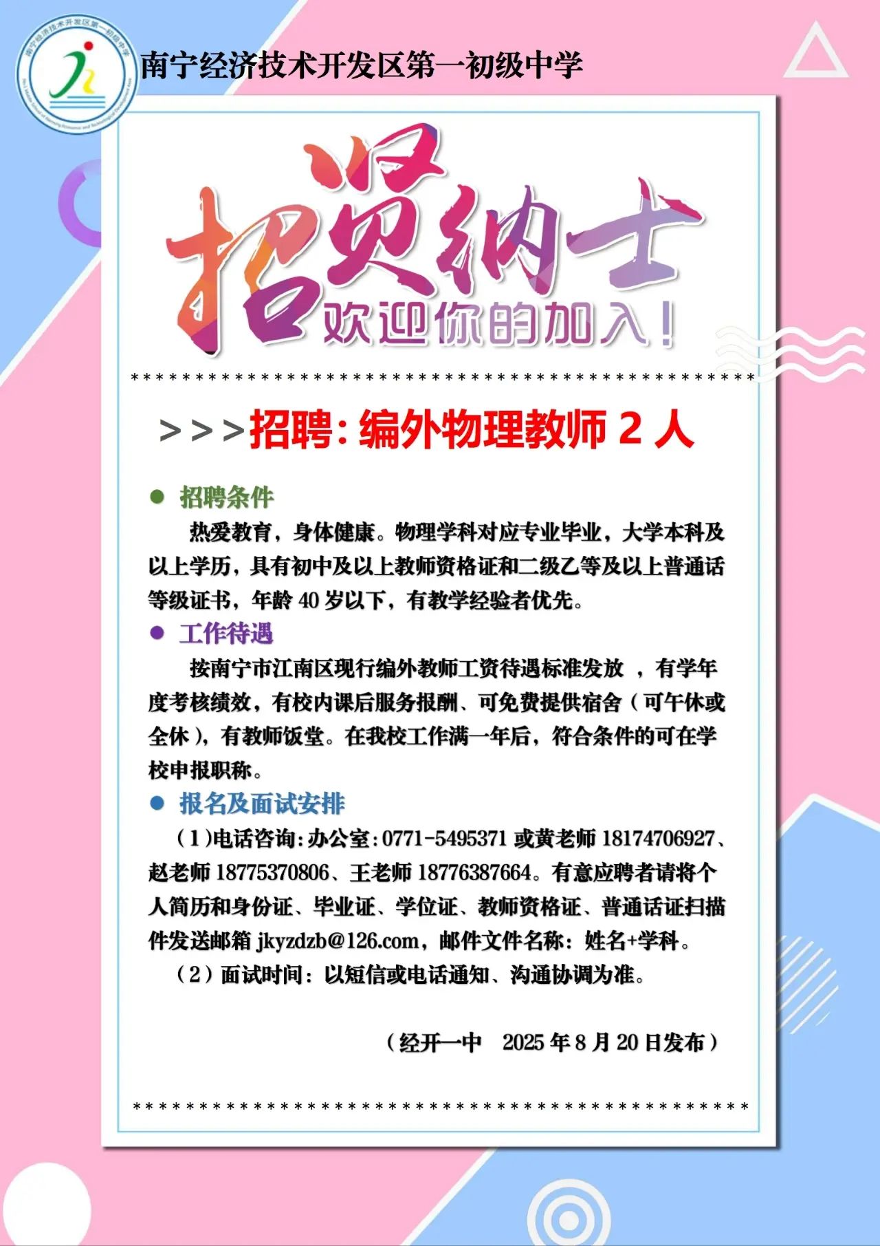 2025年南寧經(jīng)濟(jì)技術(shù)開發(fā)區(qū)第一初級中學(xué)招聘物理教師