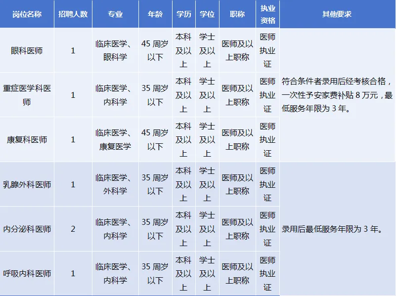 ■ 眼科、康復醫學科、重癥醫學科醫師為我院緊缺崗位人才,符合條件錄用者,經試用考核合格后可享受安家費補貼。