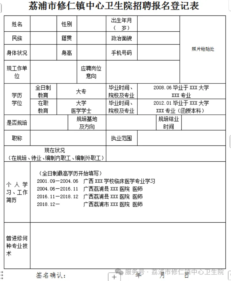 4.現場報名須知:請將簡歷投遞至荔浦市修仁鎮建北街287號,荔浦市修仁鎮中心衛生院院辦公室。
