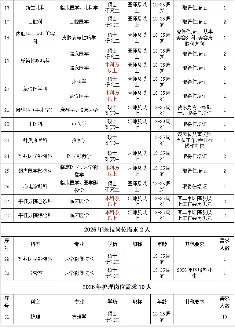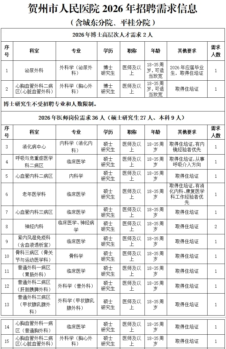 根據(jù)醫(yī)院發(fā)展規(guī)劃,招聘工作堅(jiān)持公平公正公開,堅(jiān)持德才兼?zhèn)?、人崗相適、擇優(yōu)錄取、雙向選擇的原則,2026年計(jì)劃引進(jìn)博士、碩士高層次人才及招聘工作人員共計(jì)50名(詳見附件:賀州市人民醫(yī)院2026年招聘需求信息)。