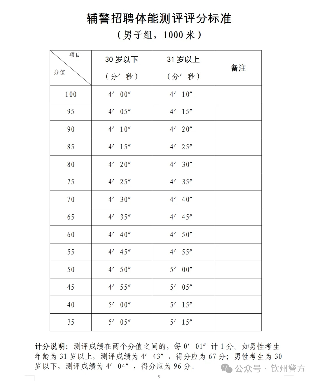 1.體能測試。資格審查合格的考生參加體能測試。體能測試項目為長跑,即男子1000米,體能測試計算成績,評分標準附后。