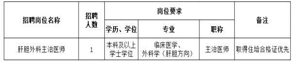根據醫院發展需要,現面向社會急招肝膽外科主治醫師1人,有關招聘事項公告如下:
