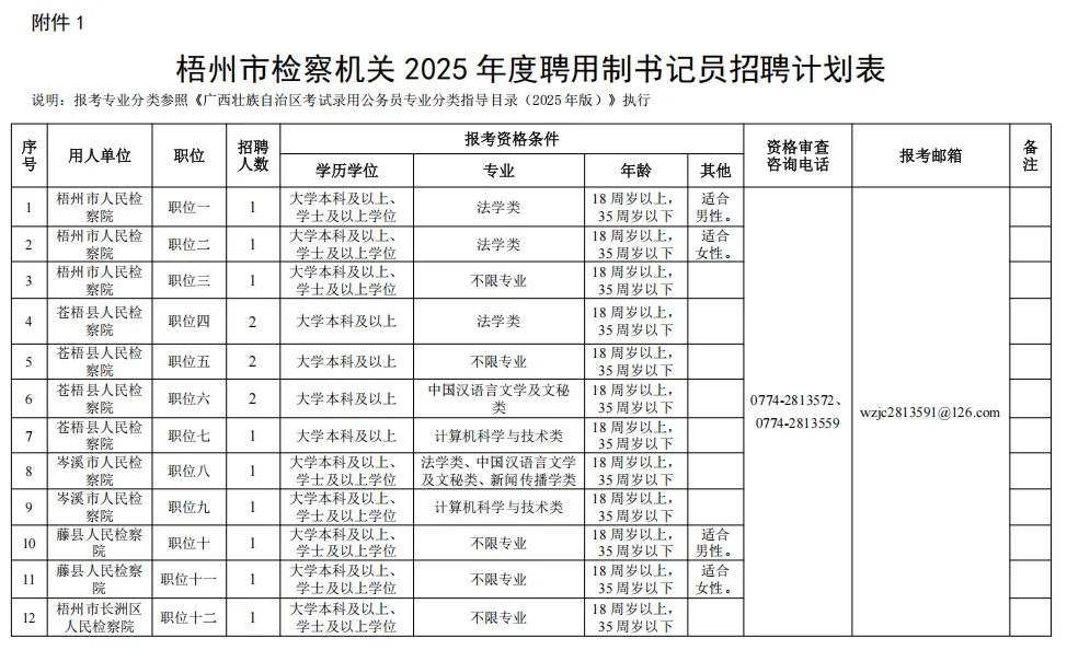 各職位具體報考條件詳見《梧州市檢察機關2025年度聘用制書記員招聘計劃表》。