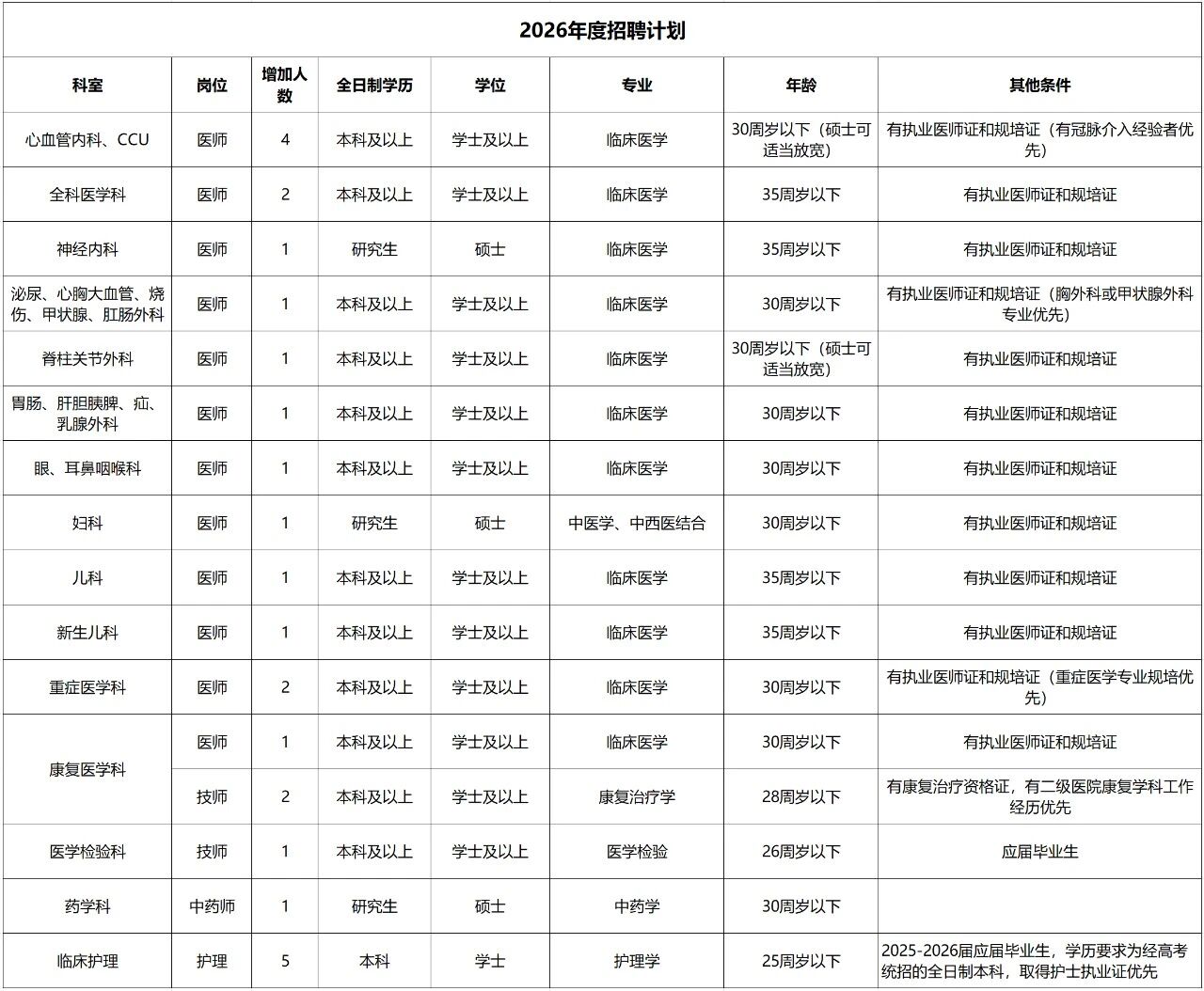 (二)醫院招聘的所有崗位均要求畢業時須同時取得應聘崗位所需的學歷、學位證,緊缺崗位可放寬學位條件。同時須取得住院醫師規范化培訓合格證書、醫師資格證書、醫師執業證書。