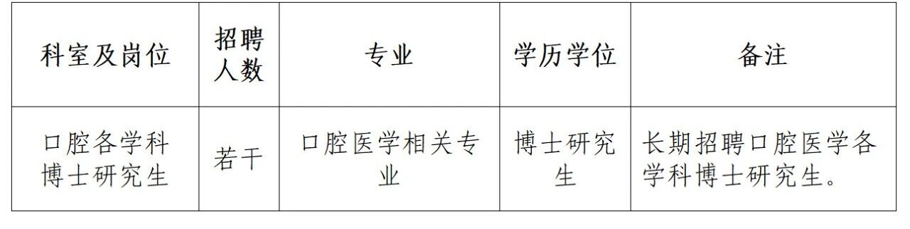 人才條件:35歲以下,口腔醫(yī)學(xué)相關(guān)專業(yè)研究生畢業(yè),獲碩士學(xué)位。