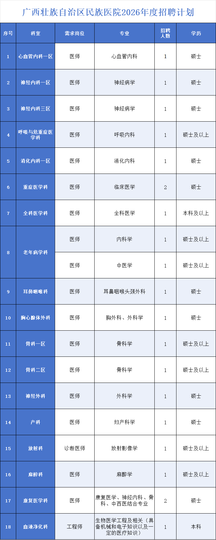 (地址:廣西南寧市西鄉塘區明秀東路232號廣西壯族自治區民族醫院8號樓3樓人事科,聯系人:莫老師,郵編:530001,聯系電話:0771-3110058)