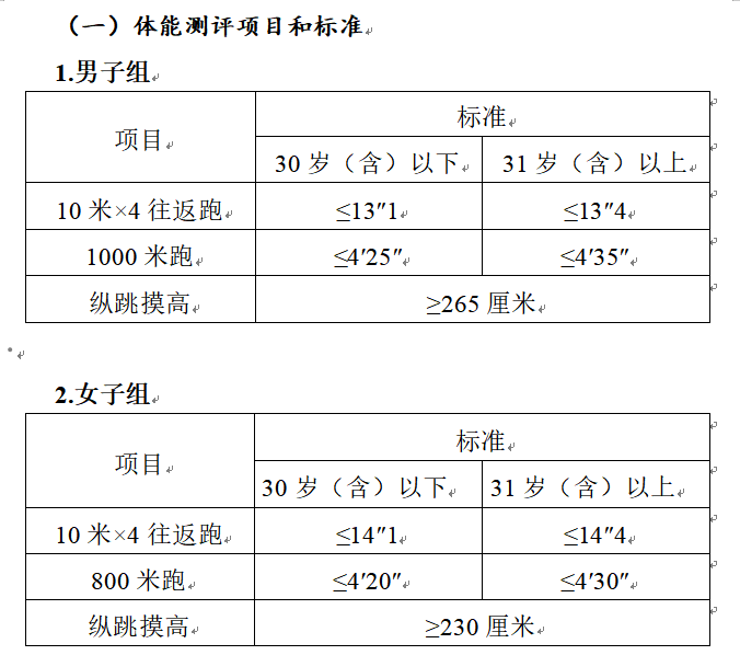 參照《關于印發<公安機關錄用人民警察體能測評項目和標準>的通知》(公政治〔2024〕60號)執行,每個測評項目分別記錄成績。其中縱跳摸高的測評次數不超過3次,10米×4往返跑測評次數不超過2次,男子1000米跑、女子800米跑測評次數均為1次。