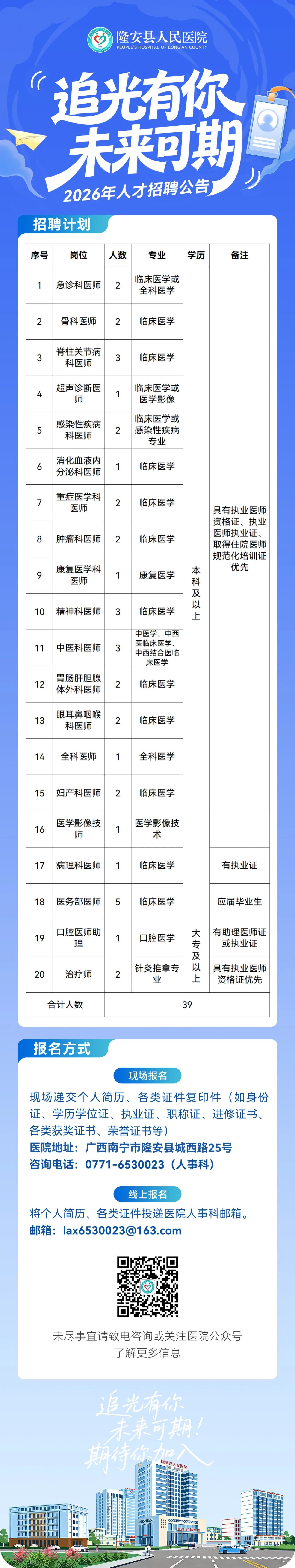 原文標題:2026年隆安縣人民醫院人才招聘公告