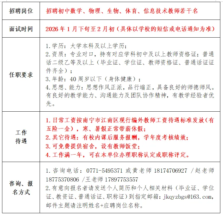 原文標題:南寧經濟技術開發區第一初級中學2026年春季學期教師招聘公告